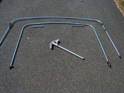 The boat was measured for width. Each top support was disassembled into the two side legs and the center bow. The center bow piece had 10 inches removed from each end, then the side legs reattached. In the picture the large top support is the original size, the smaller one has been cut down and the corner bends have been tightened with the conduit bender. The two 10 inch sections are near the top of the bow.