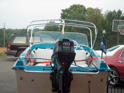 From the rear you can see that the top mounts at the widest part of the boat. At this point I am not sure if a track slide will be used to move the top out of the way when folded down. Top mounts in both horizontal and vertical were ordered so I have the choice of mounting on the top or inside of the gunnel.