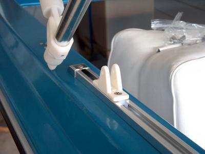 Setting up the slide track for top mounting. Tried to mount the track on the inside of the gunnel but the top frame would bind against the gunnel and not go down more than half way. So top side it is!
