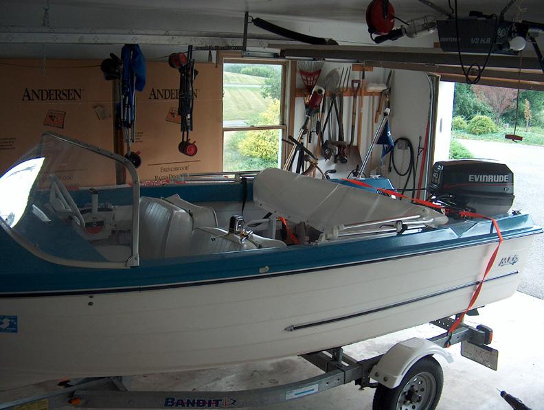 Here the top is folded down. It falls across the middle of the open floor so boarding, tilting the motor and accessing any gear is difficult at best. In a boat this size space is at a premium. That is where the slide comes in.