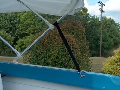 The top is held tight in the up position by two adjustable straps the clip onto loops anchored to the side of the gunnel.