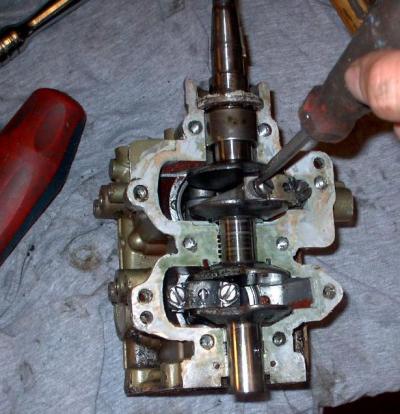 Next, you need to remove the caps. First, bend back the locking tangs on each rod cap screw with a screwdriver, then simply unscrew the connecting rod screw and set them and the caps aside.