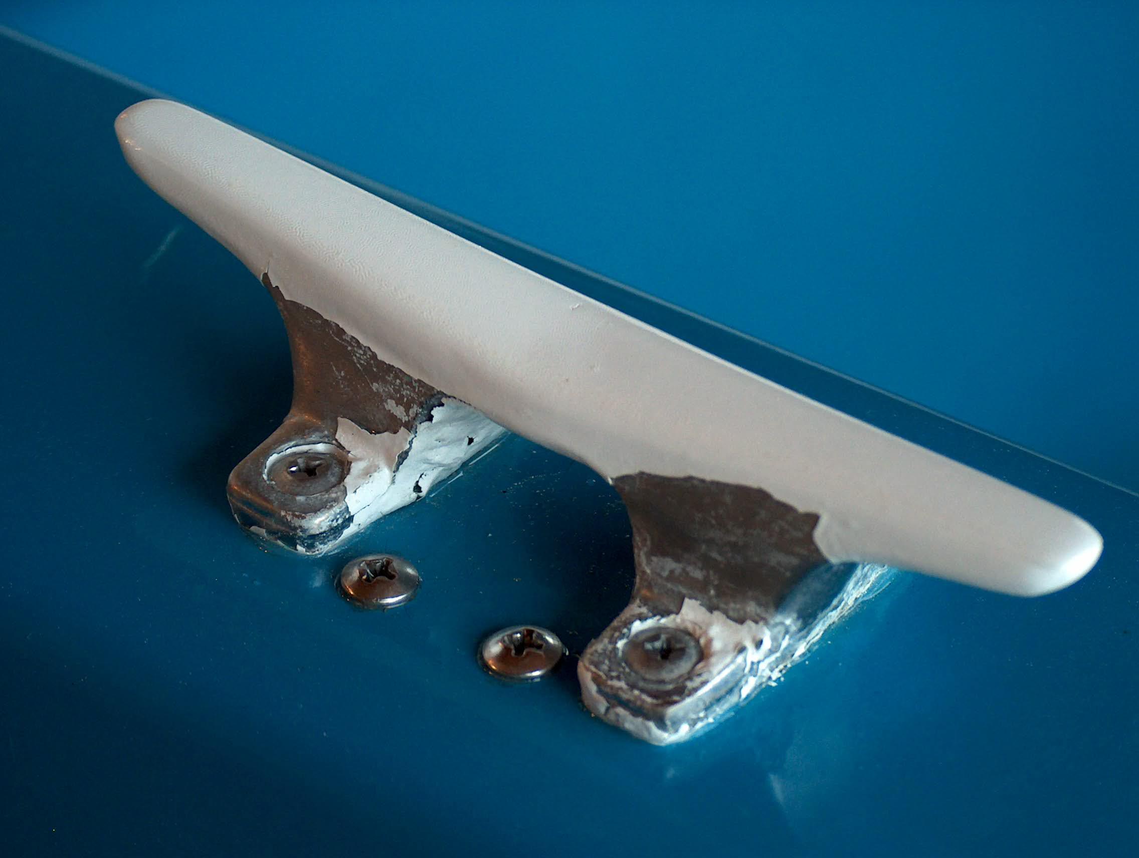 When I restored the boat these cast chrome plated cast cleats were looking crummy. I took a "short cut" and just sanded them and painted white with epoxy paint. Just two boating seasons later the salt water had taken it's toll and the cleats need to be replaced.