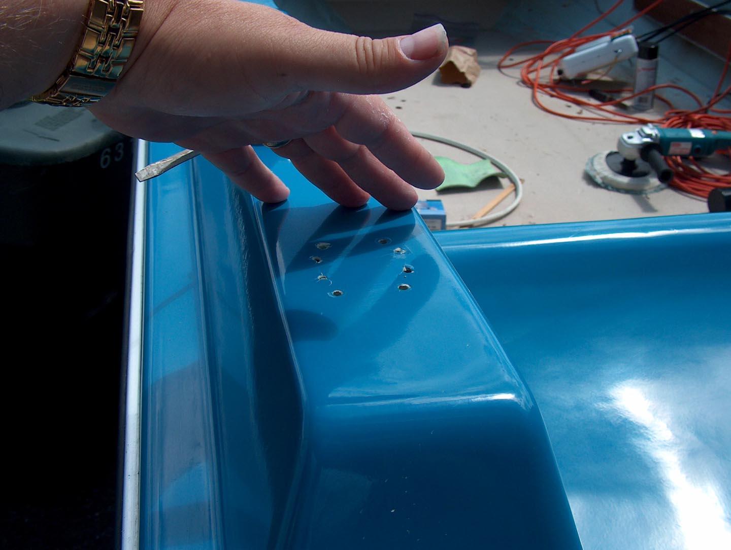 After scrubbing with Comet and pads a polisher was used with rubbing compound and then with polishing compound to bring back a shine to the gel coat. This photo shows the reflection that the polisher gave to the gel coat. I wrote an article on polishing out the gel coat. You can read it here: http://www.fiberglassics.com/mfg/restoring_glossgelcoat.htm