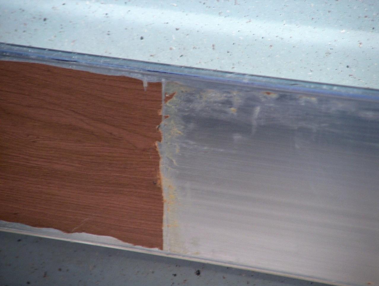 Close up photo of the ski rack. The vinyl was difficult to remove, but underneath is this great brushed aluminum extruded piece. It was a pleasant surprise. I decided that it looked so nice I will just leave it bare aluminum.