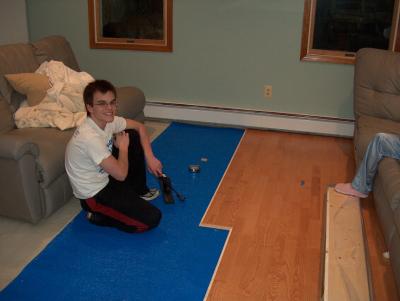 The room has a concrete floor that is above grade by about a foot or so. We wanted to install conventional hardwood flooring, but that would mean a sub floor be built and that would raise the floor above the sliding doors. So instead we went with an "Engineered Hardwood" floor by Kahrs. This floor is 3/8" Ash hardwood bonded to a lay of plywood. This floor can be nailed down, glued down, or floated over concrete. So we floated it. Even though the concrete is dry as a bone, we installed the vapor barrier to retain the floor warrentee. Floor is a locking tongue and groove install that is hammerd together. Fits tighter than anything I ever saw. Again, I got a lot of help from Jamie.