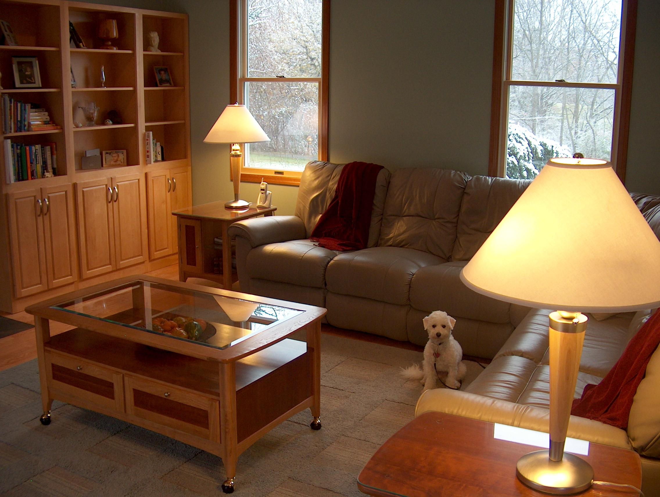 Needed new lighting for the end tables. Found these oak and polished nickel lamps on the web. They are made by Pacific Coast Lighting. A nice contemporary design that goes with the rest of the furniture. Also note the glass tops on the end tables. Local glass shop charged $35 each to cut and sand 1/4" plate glass to match the templates we made by tracing the top on heavy brown paper. Good upgrade to save the table tops from damage by kids.