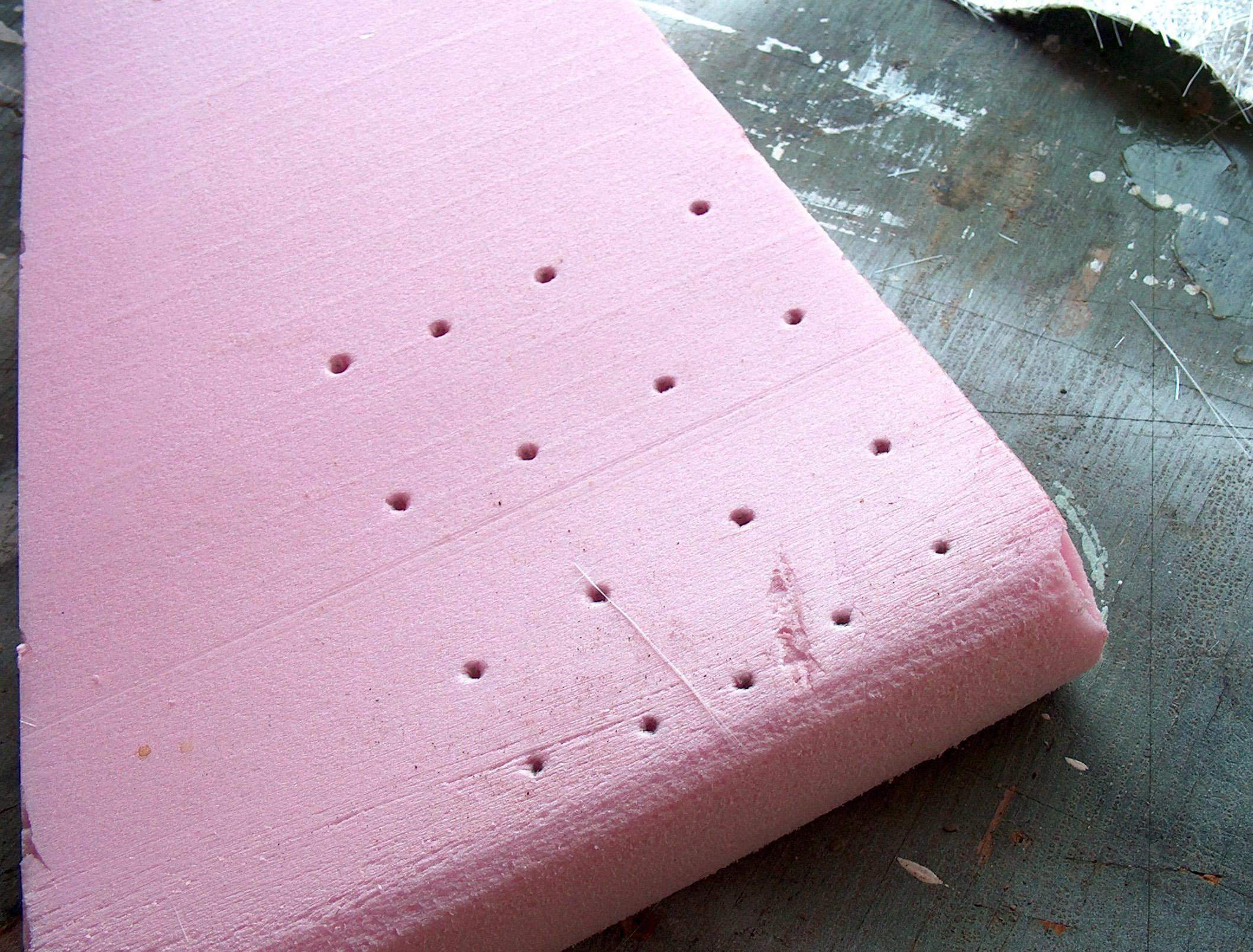 Before applying the fiberglass, holes were punched into the foam about every 1-2 inches. Hopefully this will allow the epoxy to get a better grip and not delaminate. When the first coat of epoxy was squeegeed on, I forced it into the holes.
