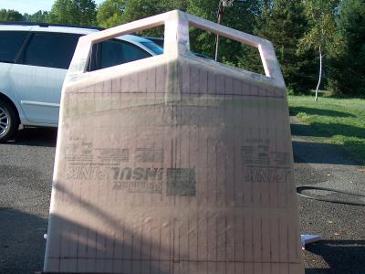 Here the top is standing on end. You can see the overlap of the glass. It will take a bit of fairing compound to eliminate the seams where there are overlaps.