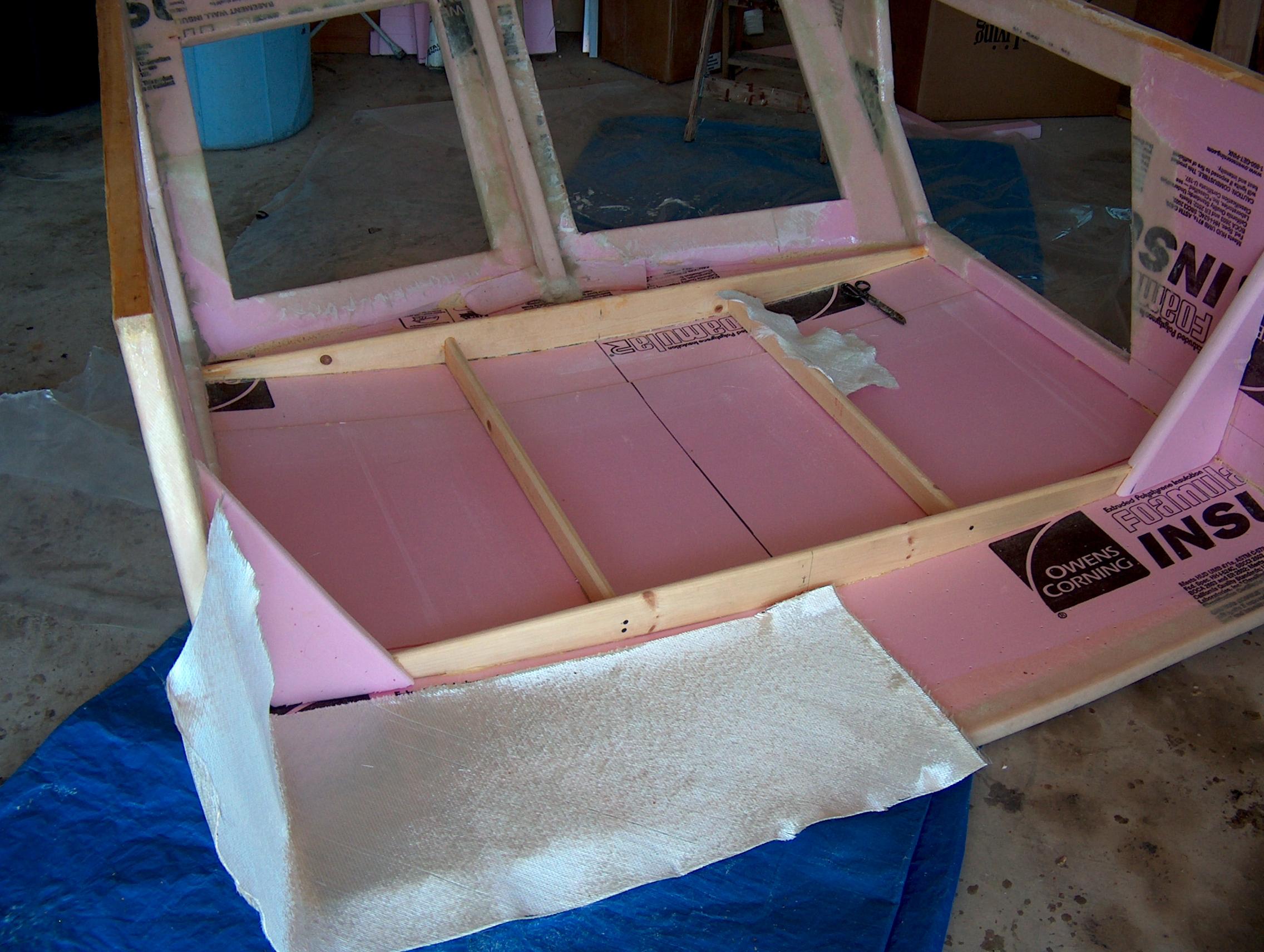 I'm using the 1708 biax top and bottom on the rearward most part of the top. It's so much easier to fit the cloth in, mark with a Sharpie marker, cut and trim and make the corner cuts for overlap. That way, after soaking the cloth with resin, its easy to put back in exact location.