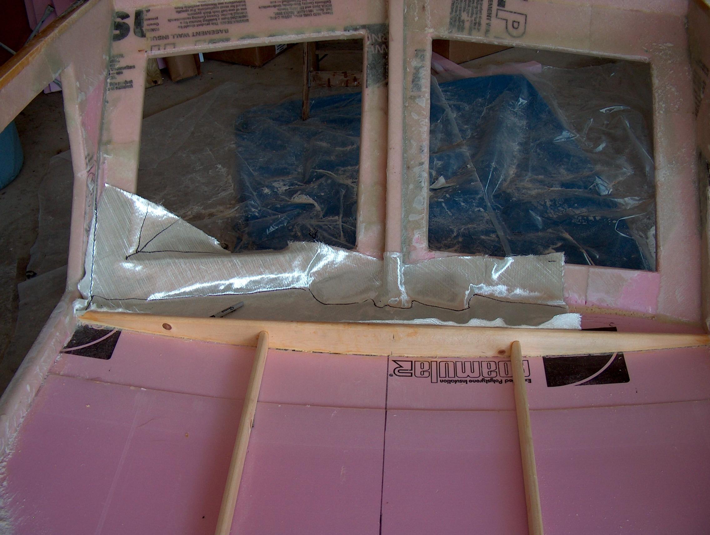 Pre-fitting more fiberglass. The 1708 molds to the contours of the top well.