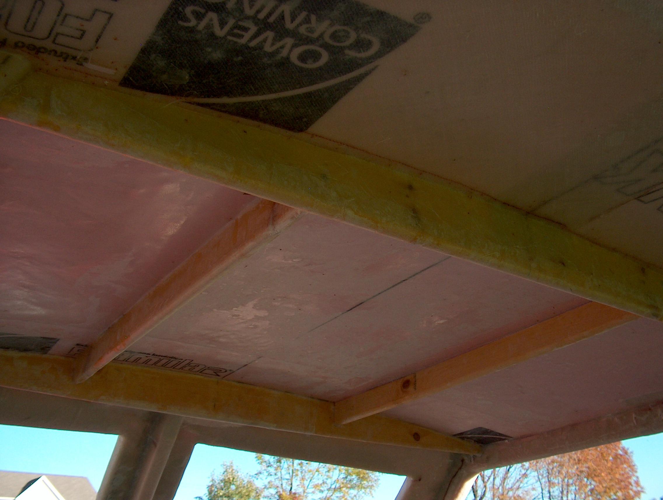 The ceiling between the front and rear cross supports is glass in using 6oz cloth. It looks clear for the most part. Some blotchy areas are because there is not enough resin on top, not from air underneath.