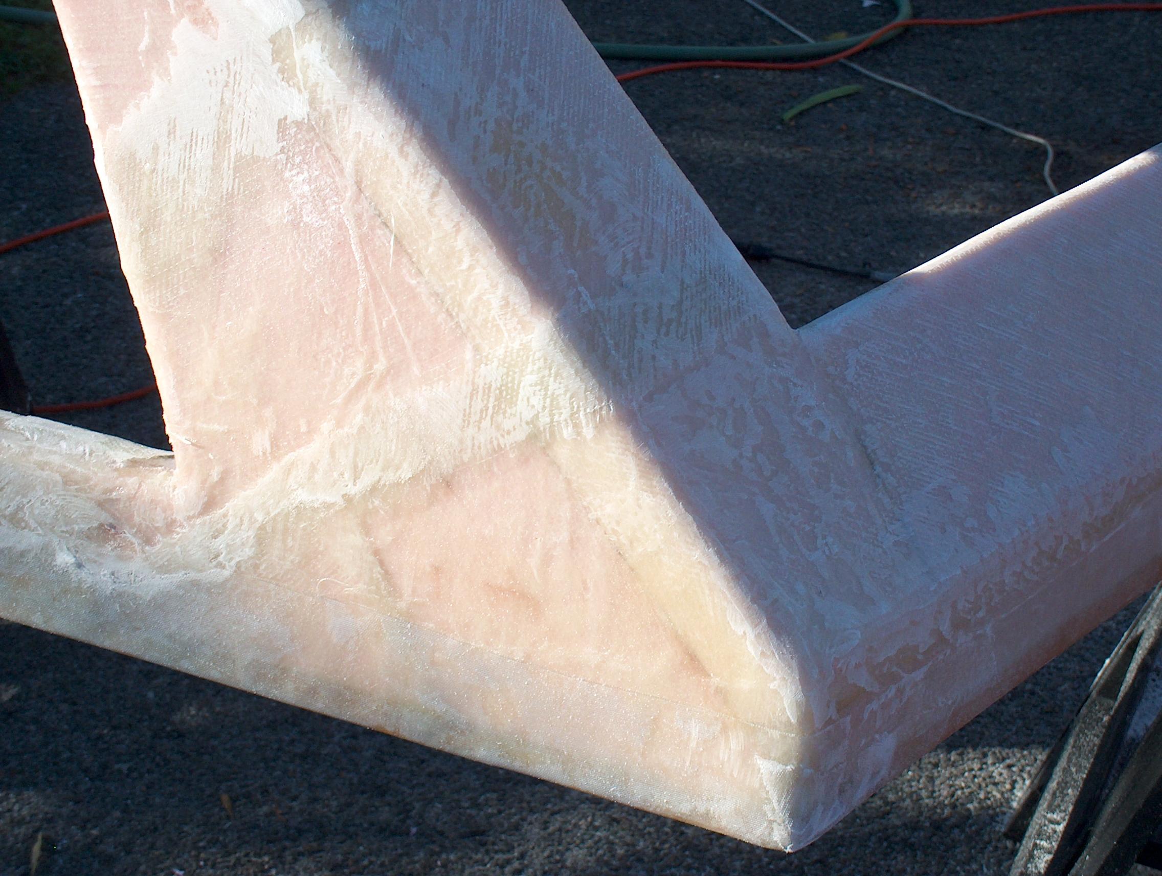 Some areas have two and three layers of the 1708 overlapping. The high spots were sanded smooth in prep for fairing compound.
