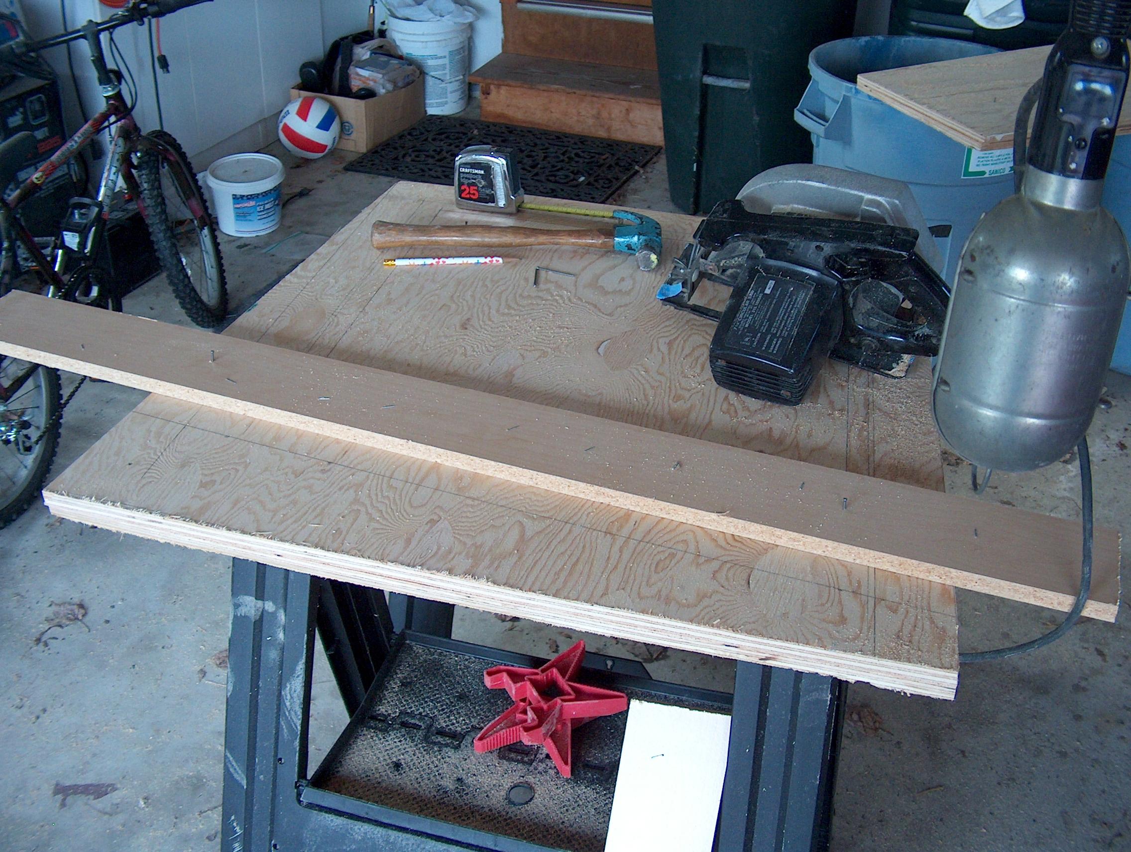 Here two pieces have been cut to rough size, and nailed together. This way, the cuts only are done once, and two identical frames are made. The pattern is drawn on the top. A piece of particle board is tacked to the ply to be used as a guide for the circular saw so the cuts are nice and straight.