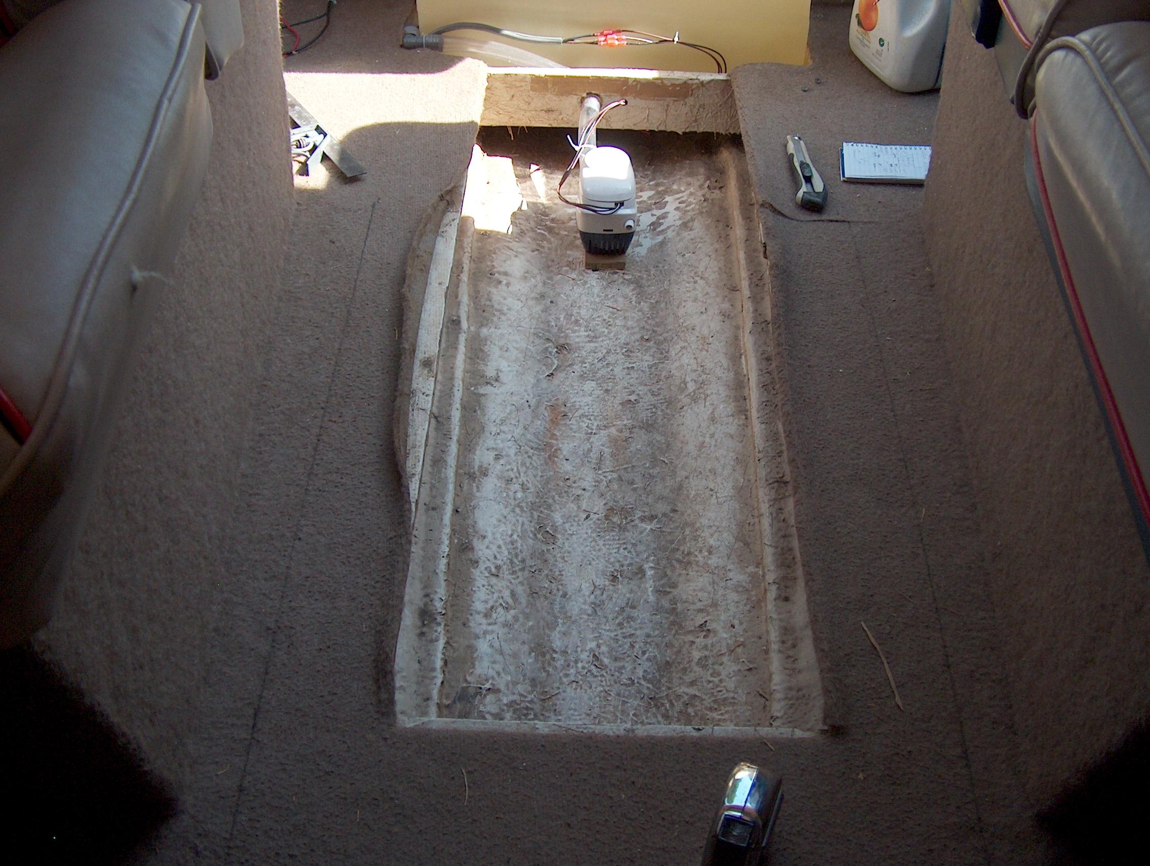 Decided to recess the deck while its still too cool to work with epoxy outside. This is the ski locker, and the new bilge pump facing aft.