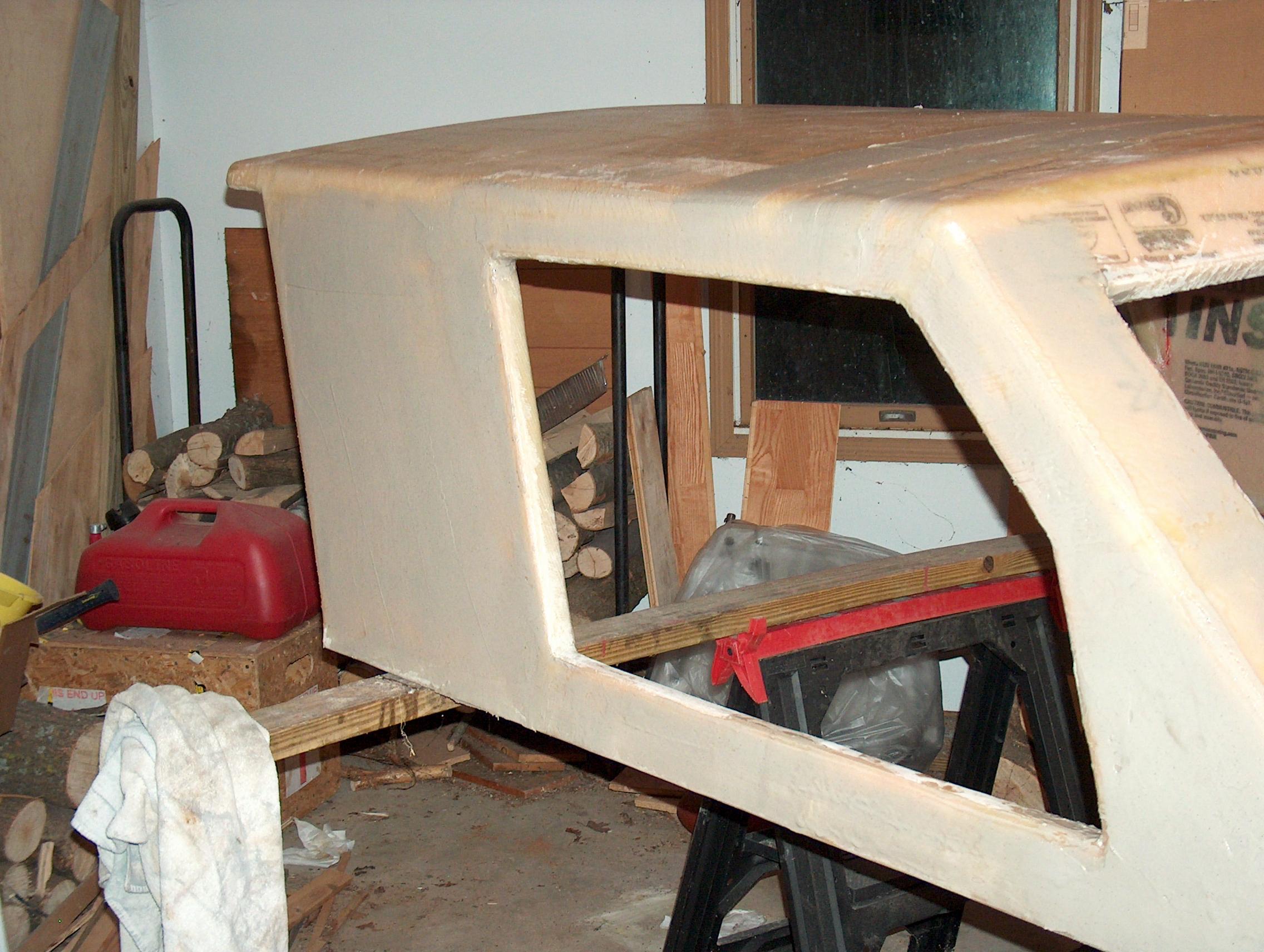 Starboard side has first coat and half of the port side is skim coated. Sanding is a problem. This epoxy based fairing is very hard, even the 7" disk sander has a hard time sanding it. Started using 24 grit disks to cut the epoxy!