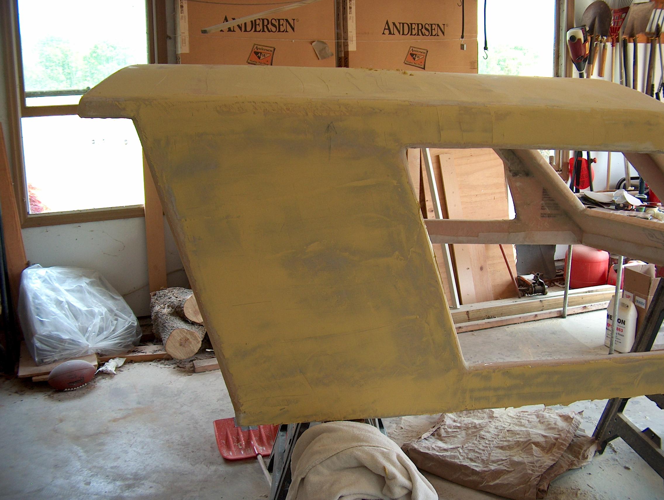 The whole roof section, front and starboard side are coated with the Marsons. Sanding has started, and its working very well.