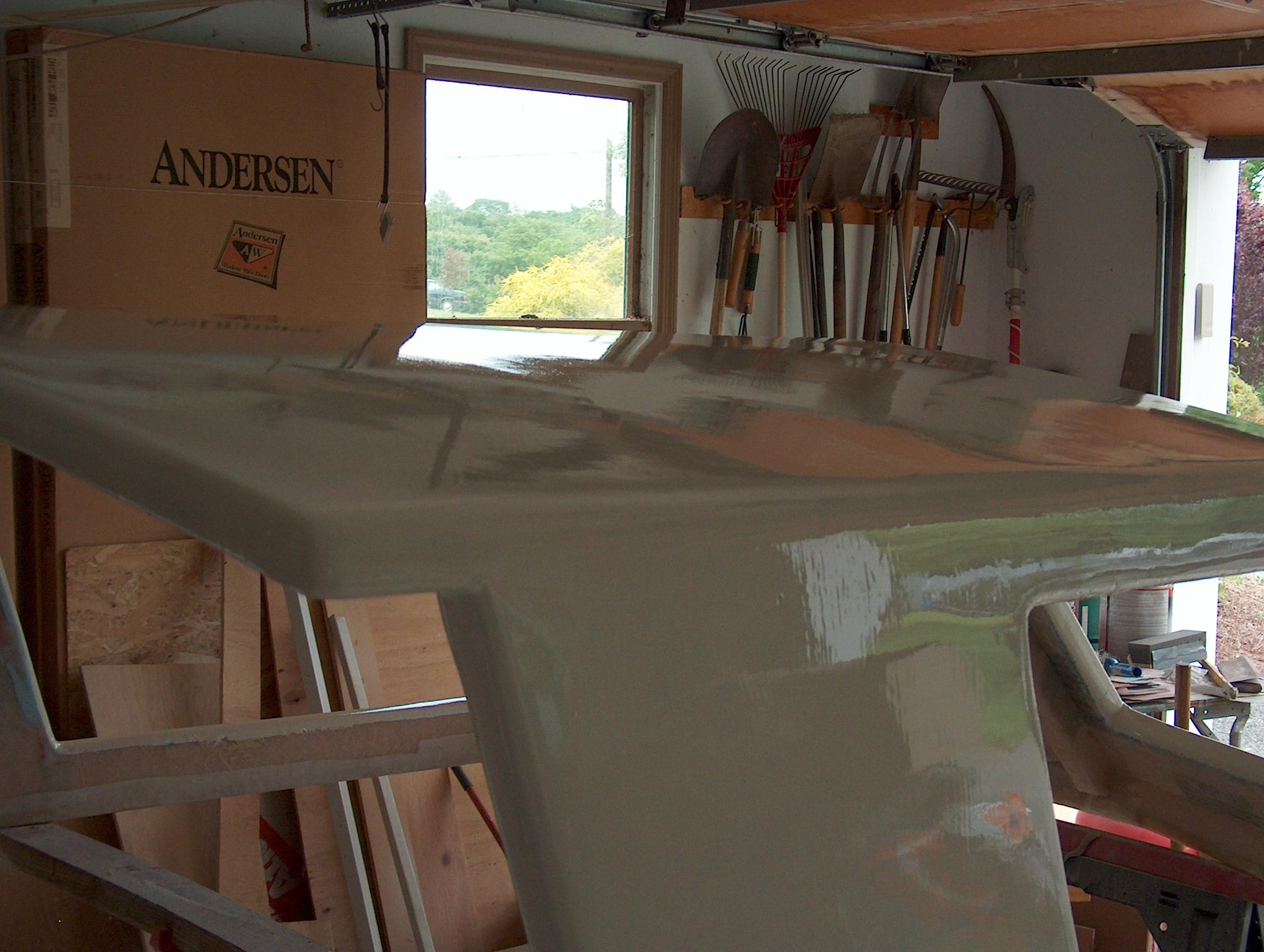 Re-sanded the whole top from 100 grit down to 220. Then applied the first coat with a foam roller and foam brush using the "roll and tip" method.
