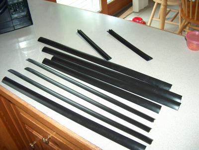 The windshield windows are going to be trimmed with the black vinyl T molding. It came in a roll and I cut the lengths needed then warmed with a hair dryer to straighten them out.
