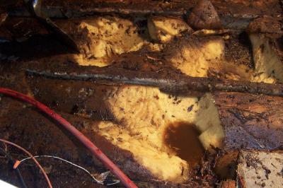 I couldn't be happier that we decided to rip out the whole floor. Some of the floor wasn't rotten, but ALL of the foam is totally soaked, with puddles of water sitting in the empty spaces. This pic is in the rear center of the boat.