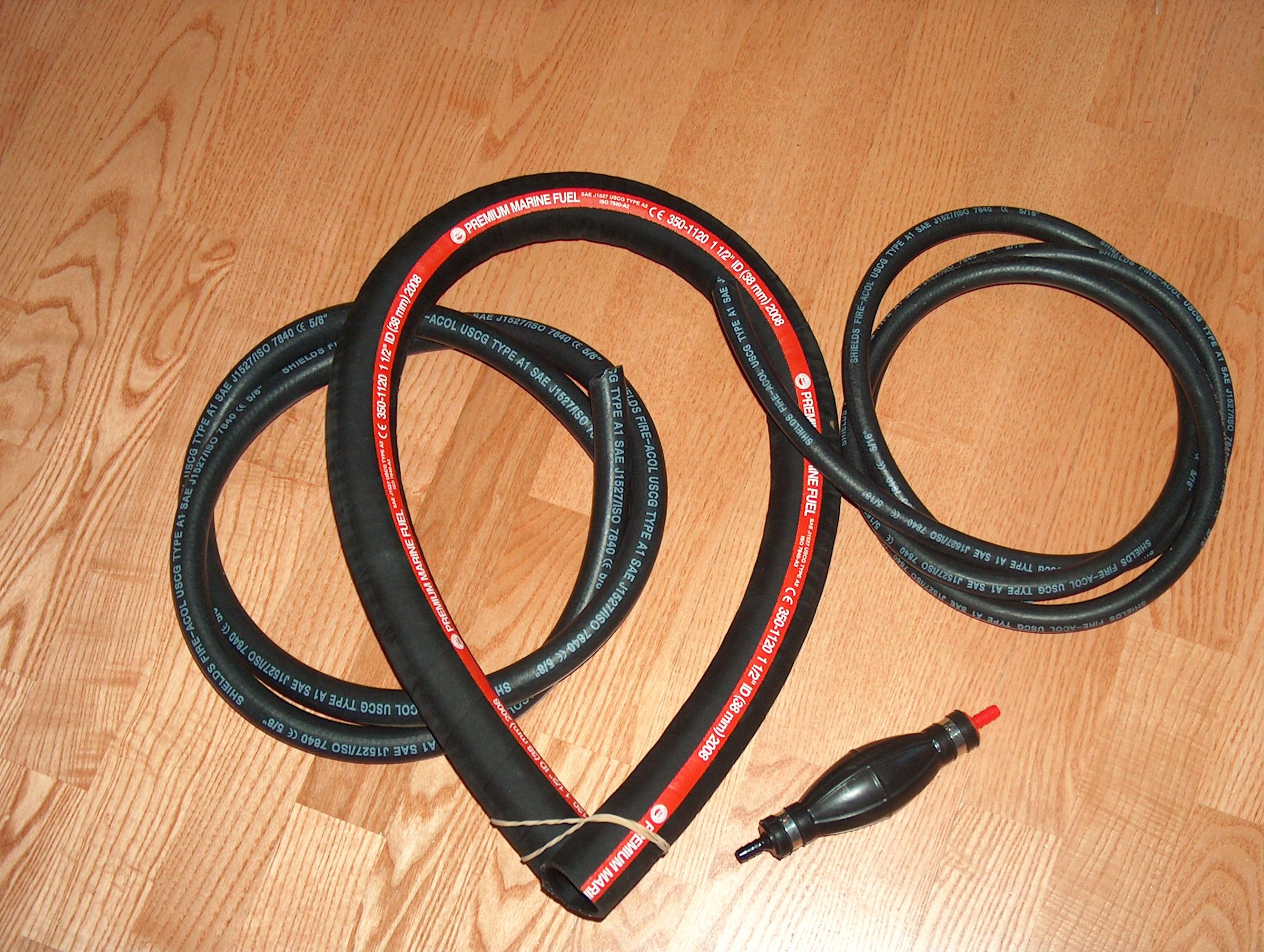 These are the hoses needed to complete the project. A 1-1/2" fill, 5/8" vent, and 5/16" fuel line. Also need a 5/16" primer bulb with stainless steel check valves and stainless banding to prime the motor.