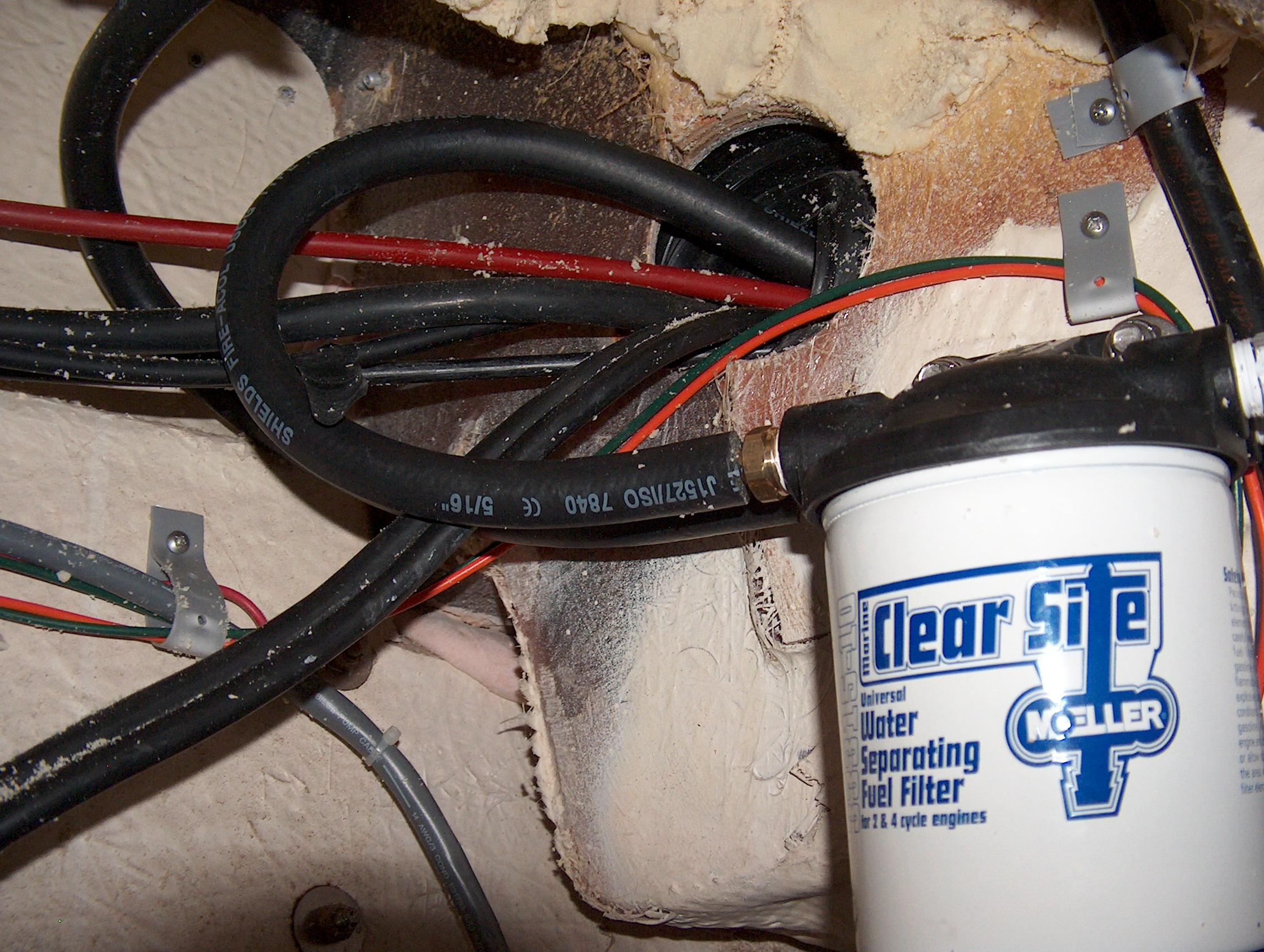 This photo shows how the fuel lines enter and exit the filter, then pass through the boot out to the splashwell and outboard.