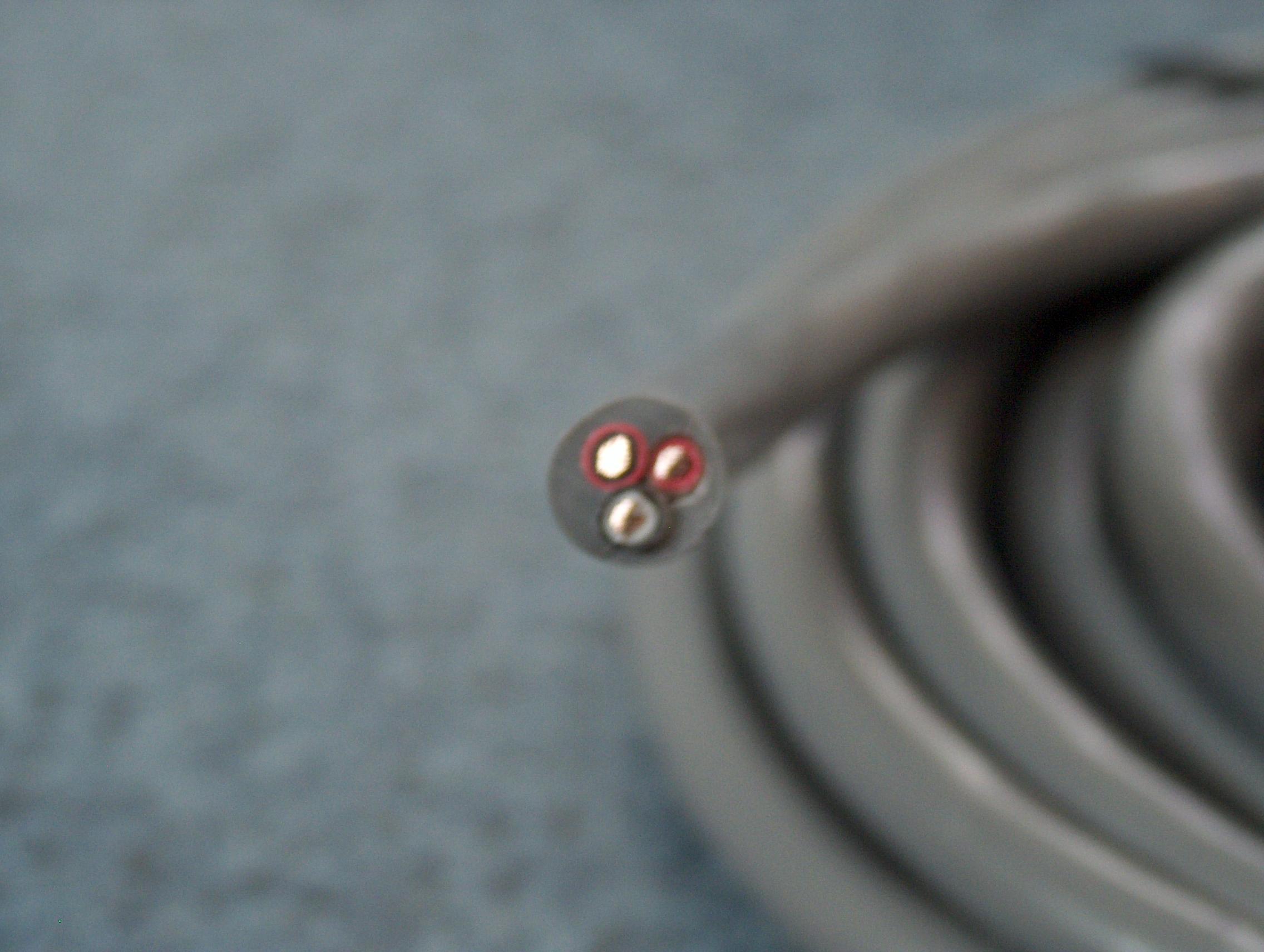 This bilge pump wire is heavy duty marine quality tinned 14 awg wire, with the jacket molded around the three inner wires instead of just slipping three wires into a plastic jacket. The red wire is connected to the battery with a 5 amp fuse and carries power to the dashboard switch. The brown and black wires carry the power back to power the pump. Depending on the switch position, either the black or brown wire is powered.