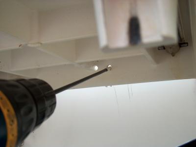 Drilled two 3/8" holes in the skirt of the swim step, then used a 12" long bit through the access holes to drill into the transom. Worked like a charm.