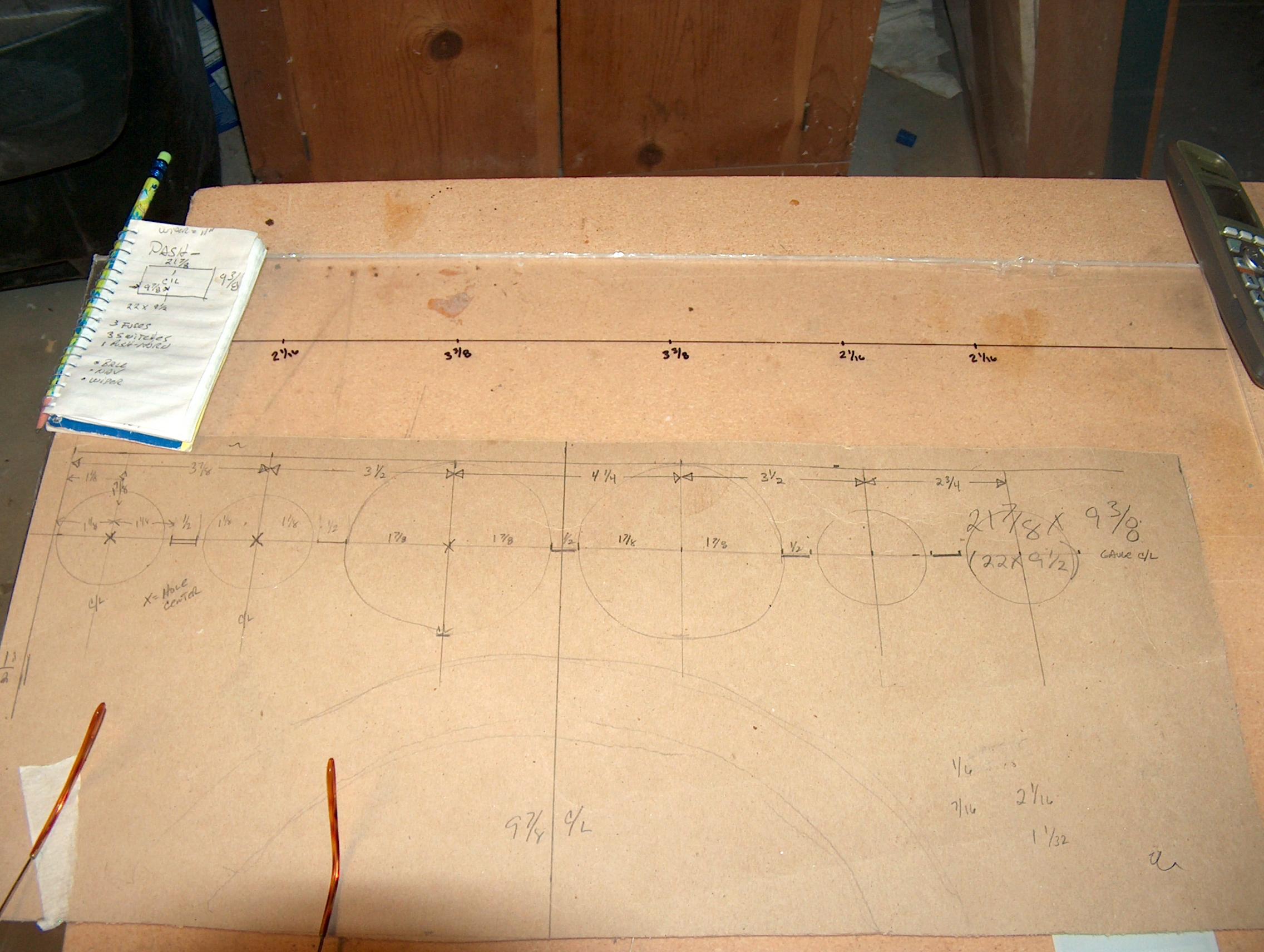 To install all the new gauges, a new dash panel is needed. The new panel is 1/4" clear Polycarbonate. The gauges were laid out on a cardboard mock up of the dash, then the dimensions transferred to the Polycarbonate to have holes cut for the gauges.