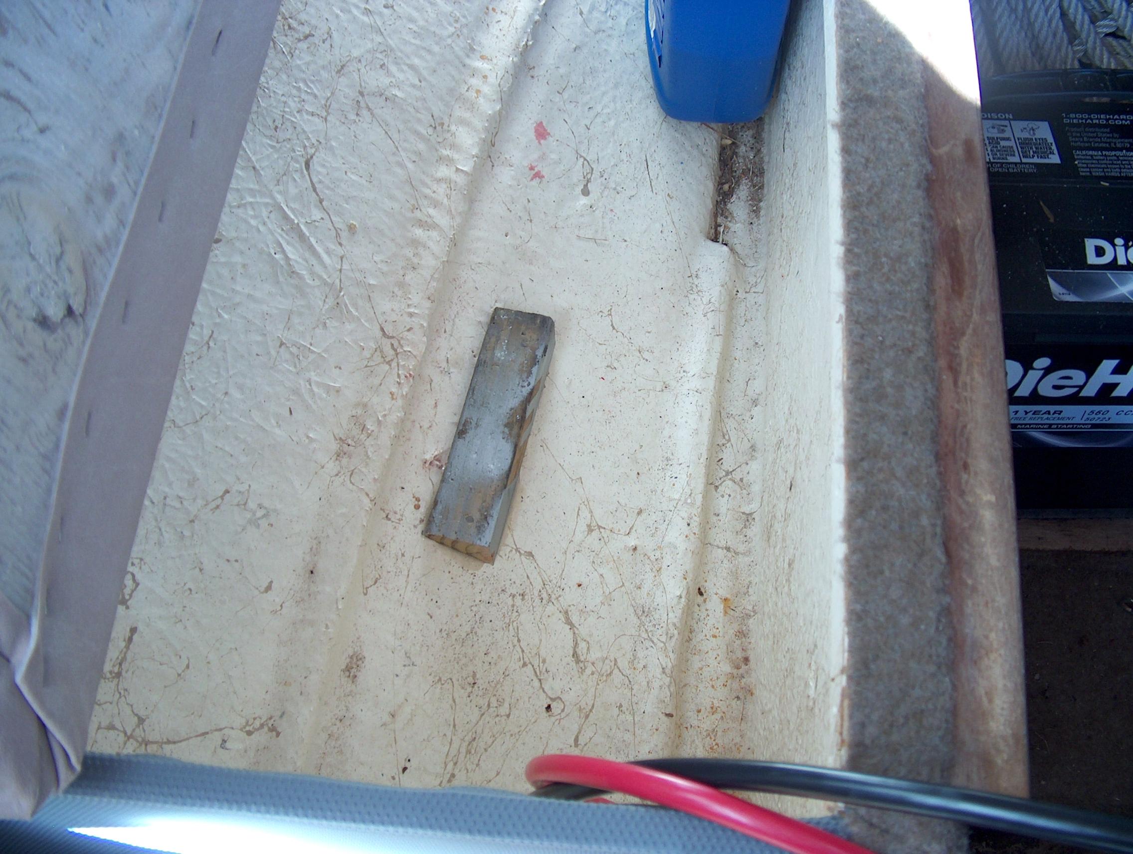 The two batteries are being reloaced to the cuddy V-birth storeage compartments. This will make room in the rear for the oil tank that the Johnson needs. This photo shows a support block epoxied in place in the port compartment to support a battery platorm.