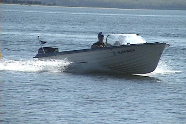 Another shot from video shows how flat its riding while cruising about 15 - 20 mph. Moving the fuel weight from the rear and adding it to the front made a dramatic improvement in the handling of the boat. As long as there is between a 1/4 and full tank, the porposing that occurred at full throttle is gone. It rides very nice. The extra weight in the bow helps it cut through chop and wake better than it did with the gas tanks in the rear. I am very pleased with the results of this project.