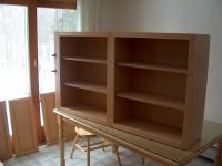 Three units, 24", 30" and another 24" were glued and screwed together to make a single unit. Then the whole unit was screwed to the wall. One reason I ordered these book cases from cab-net.com was that the cases are made from solid hardwood or veneer plywood. No press board or MDF is used in the book cases. The big brown board leaning against the cases is the top for the entertainment center.