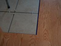 The new hearth is ceramic tile and is flush to the floor. In this photo, the tile is being test fit to the cutout in the wood flooring.
