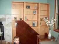 After the computer desk was done, the book cases were test fit for spacing to the right of the fire place. The room is becoming usable again as the sectional is put back in place.