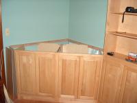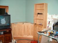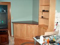 These cabinets and book case make up the entertainment center. The base cabinets were glued and screwed together to make a single unit. The back left and right corners were cut off the cabinets to make them fit as per the plan. A false left end panel was added at 45* angle to front to make it look right.