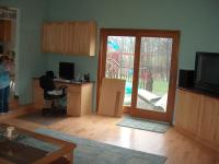 The room has a concrete floor that is above grade by about a foot or so. We wanted to install conventional hardwood flooring, but that would mean a sub floor be built and that would raise the floor above the sliding doors. So instead we went with an "Engineered Hardwood" floor by Kahrs. This floor is 3/8" Ash hardwood bonded to a lay of plywood. This floor can be nailed down, glued down, or floated over concrete. So we floated it. Even though the concrete is dry as a bone, we installed the vapor barrier to retain the floor warrentee. Floor is a locking tongue and groove install that is hammerd together. Fits tighter than anything I ever saw. Again, I got a lot of help from Jamie.