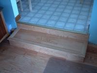 The new step is covered with the Ash flooring. The edge of the tread is made from Bull Nose ordered with the flooring. The baseboard heat pipe passing through the step is also boxed in using flooring. The finish wall trim on either side of step is not installed in this photo.