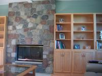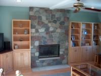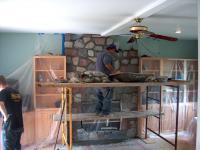 After doing a lot of research, I decided it was best to hire a stone mason to do the fireplace. I covered the cabinets and wall with plastic, and the mason put down 1/2" flake board over heavy roll paper on the new floor to protect it. These guys did outstanding work. I'm glad I had a pro do it because they cut almost every stone they placed.