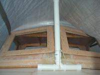 Two tension lines keep the top square while the front windshield panels are cut and fit. Making them run from the roof support to the sides rather than diagonal across the boat leaves the cabin open for me to walk in and out.