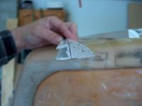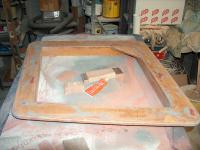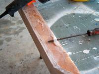 With the windshield off, I was able to lay out how the two windshield panels will sit on the dash. Hard to see in the photo, but there are pencil lines that intersect in the middle of the boat at a 34* angle. This is the center line of the boat, but the boat is not entirely symmetrical. The port side is 1/2 wider than starboard measuring from the center line. The hard top will have two windows in the windshield where the original windshield had three.