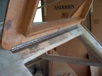 This photo shows the PVC trim screwed in place and a piece of window track is laying on the bottom trim.