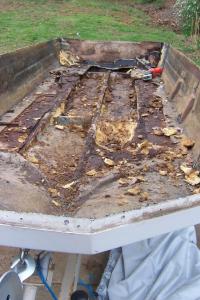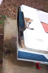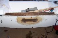 Showing the inside skin of the transom, and the little bit of rotted transom wood left to remove.