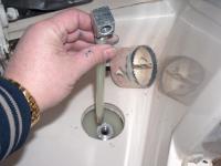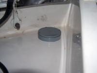 The deck plate is screwed on from below. The splashwell is curved in this area, so the deck plate had to be sanded with a small disk sander until it fit the contour of the splashwell.