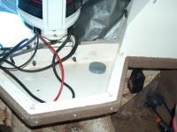 Of course, there is a big block of foam right where I wanted to put the 3 way fuel valve. Foam is not easy to remove, but using a 3" hole saw in the cordless drill made things a lot easier. Here the round hole saw marks can be seen where the foam was removed. This shot is taken looking straight up from the floor under the transom cap.