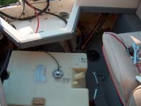 The two batteries are being reloaced to the cuddy V-birth storeage compartments. This will make room in the rear for the oil tank that the Johnson needs. This photo shows a support block epoxied in place in the port compartment to support a battery platorm.
