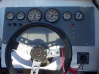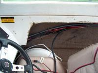 The side panel is fit back in place. The helm end of the wire harness with ignition switch and gauge connections can be seen under the dash.