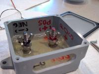 Two stainless steel 5/16 x 2" carraige bolts are used for the studs. The sides of the heads are ground flat so they will not spin in the epoxy. About 3/8" is cut off the end so the bolts fit inside the box, then 4 ounces of epoxy is poured in. Note that the epoxy got so hot that it expanded a bit around the parimiter. But the bolts are held in tight. A couple of nuts, washers and wing nuts complete the hardware. Cut a 3/4" wide slot in the bottom to feed the 4 AWG cables through. And labeled the posts Positive and Netagive to prevent accidental crossing of cables.