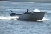 Here is a shot from the first test runs taken from video. It shows how the boat rides much flatter even under heavy throttle "hole shot" as in this picture. Even though this was not full throttle, the boat can still be seen running very level with good attitude on take off. That's my Dad in the passenger seat. Brave soul.