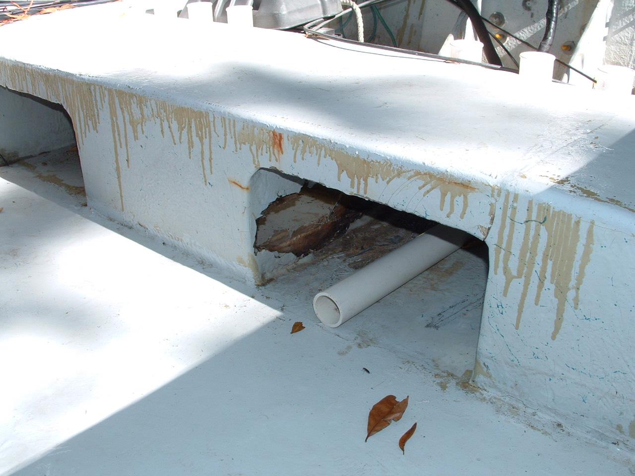 Hole through plywood suport. Shows general condition of boat. Unfortunately the prior owner covered up the same sort of rot on the floors and elsewhere. Not only did that make the boat heavy and rotten, but it left what I am sure is soaked foam underneath as well.