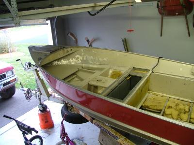 Here's what was under the front deck. Everything is OK here as well. In the process of removing the console I found that the rat's nest of wiring there was for a trolling motor formerly mounted on the bow. When I examined the wiring that was still functioning I was very pleased to find it to be in good condition. I'll replace the switch panel and clean everything up, but the boat won't need to be completely rewired as I had thought. The old flooring and panels are still solid enough to be used as patterns for the new so that part of the project should be straight-forward.